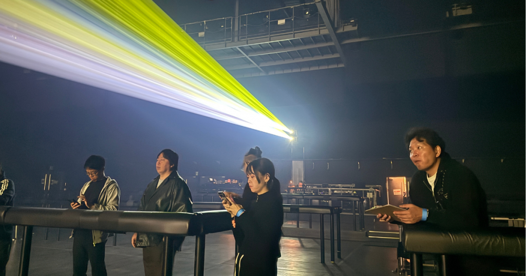 会場の下見では、会場で流す映像やライトのチェックをおこないます。